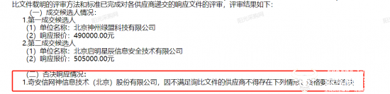 没想到,一天后,在中国电信另一省分公司某项目的成交候选人公示中,奇安信网神也被否决响应了。