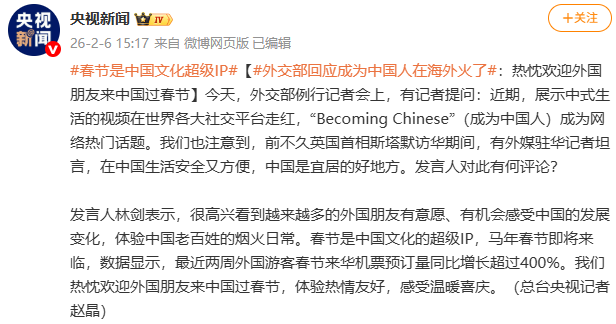 发言人林剑表示,很高兴看到越来越多的外国朋友有意愿、有机会感受中国的发展变化,体验中国老百姓的烟火日常。春节是中国文化的超级IP,马年春节即将来临,数据显示,最近两周外国游客春节来华机票预订量同比增长超过400%。我们热忱欢迎外国朋友来中国过春节,体验热情友好,感受温暖喜庆。(总台央视记者赵晶)