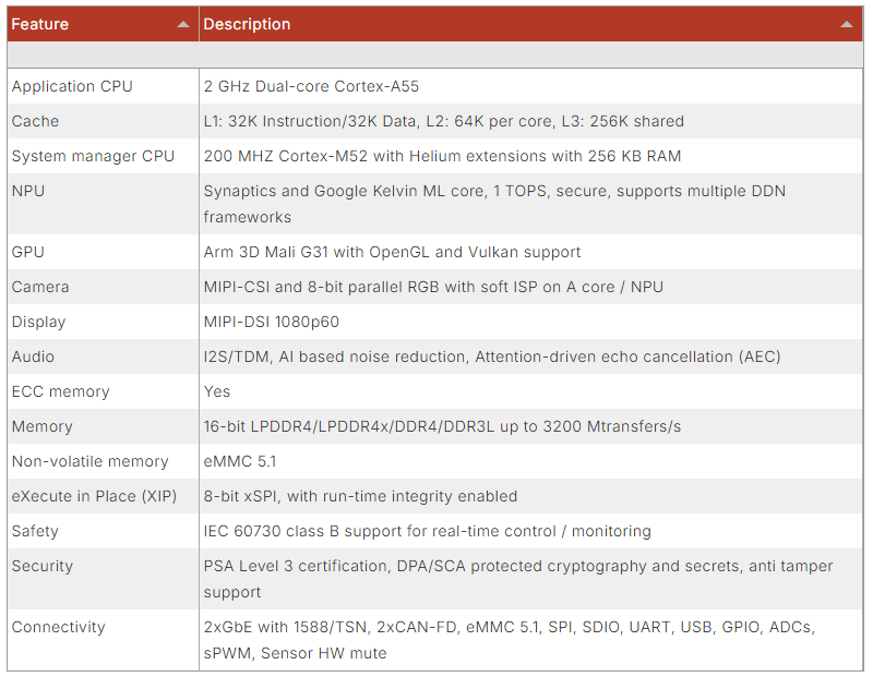 Synaptics Astra SL2610 旨在独立处理机器学习应用,并具备丰富的接口、视频和显示能力(详见下表)。