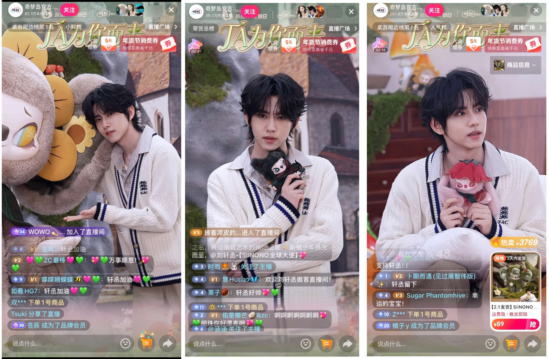 典型如,1月29日,奇梦岛 SiiNONO-TA在低语系列毛绒手办上线当天,SiiNONO全球大使刘轩丞空降抖音直播间,互动分享产品的软萌治愈设计,新品备受粉丝和潮玩爱好者的青睐。