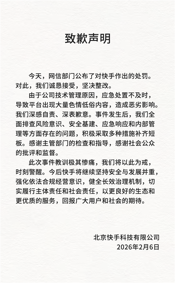 2月6日,北京市互联网信息办公室依据《中华人民共和国网络安全法》《中华人民共和国行政处罚法》等法律法规,对北京快手科技有限公司处警告、1.191亿元人民币罚款处罚,同时责令其限期改正、依法依约处置账号、从严处理责任人。