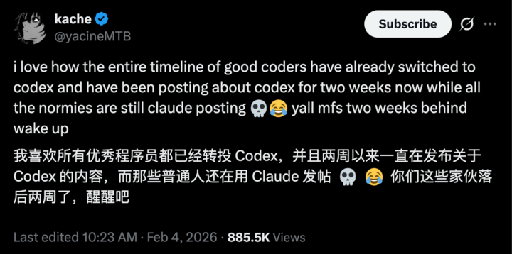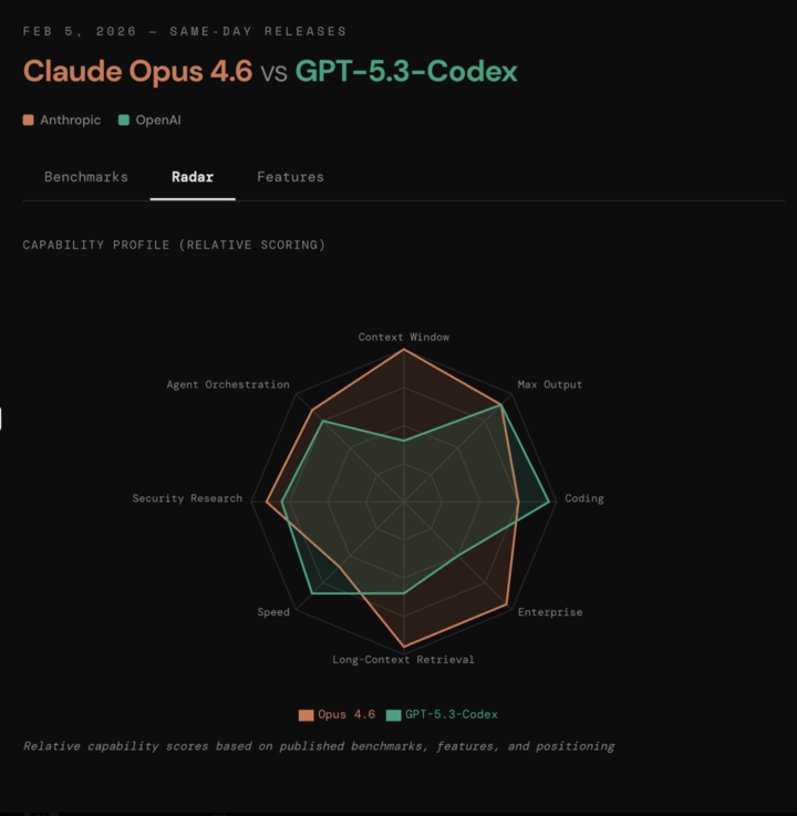 就和今天的密集发布一样,凌晨 1:45,Claude 官方发 X 推出 Claude Opus 4.6,紧接着就是 OpenAI 端上 GPT-5.3-Codex。两款模型其实都是为了给 Agent 更强大的基座能力,以前是说代码/vibe coding,但现在 Agent 能做好,基本上都是「写代码写得好」。