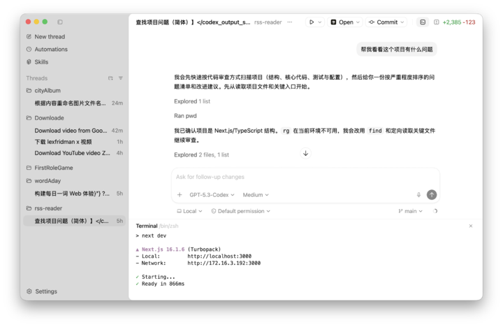 如果我们有现成的代码项目,也可以选择该项目文件夹,在 Codex 中打开,GPT-5.3-Codex 会分析项目存在的 Bug,并且修复它。