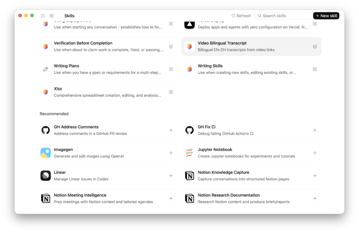 视频下载后,我们还可以要求它提取视频的逐字稿,给我们一份双语版本的文档,最后让它把整个流程打包为一个 Skill,方便下次使用。