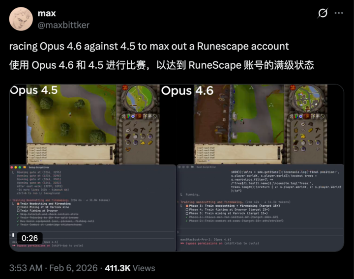 还有网友拿 Opus 4.6 和 4.5 进行对比,让两个模型玩同一款经营游戏,看谁的账户等级、财富和装备更高。测试博主提到,4.6 版本在初期制定战略的时间更长,但是做出了更好的战略决策,并且在最后确实做到了遥遥领先。