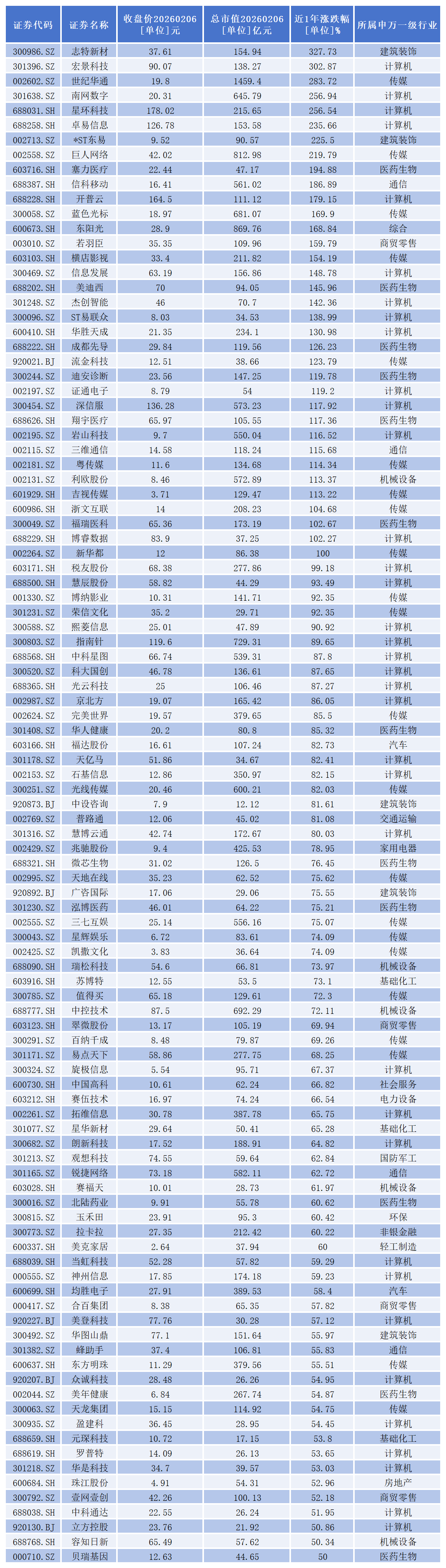 其中,志特新材(300986.SZ)、 宏景科技(301396.SZ)、世纪华通(002602.SZ)、南网数字(301638.SZ)、星环科技(688031.SH)、卓易信息(688258.SH)、*ST东易(002713.SZ)、巨人网络(002558.SZ)、塞力医疗(603716.SH)、信科移动(688387.SH)、开普云(688228.SH)、蓝色光标(300058.SZ)、东阳光(600673.SH)等35家公司近一年股价成功实现**。