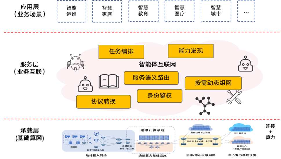 动态组网与服务语义路由:通过智能体服务网关、网络控制器与编排器,实现面向智能体协同任务的按需动态组网、大模型算力供给的算网融合服务语义路由等。