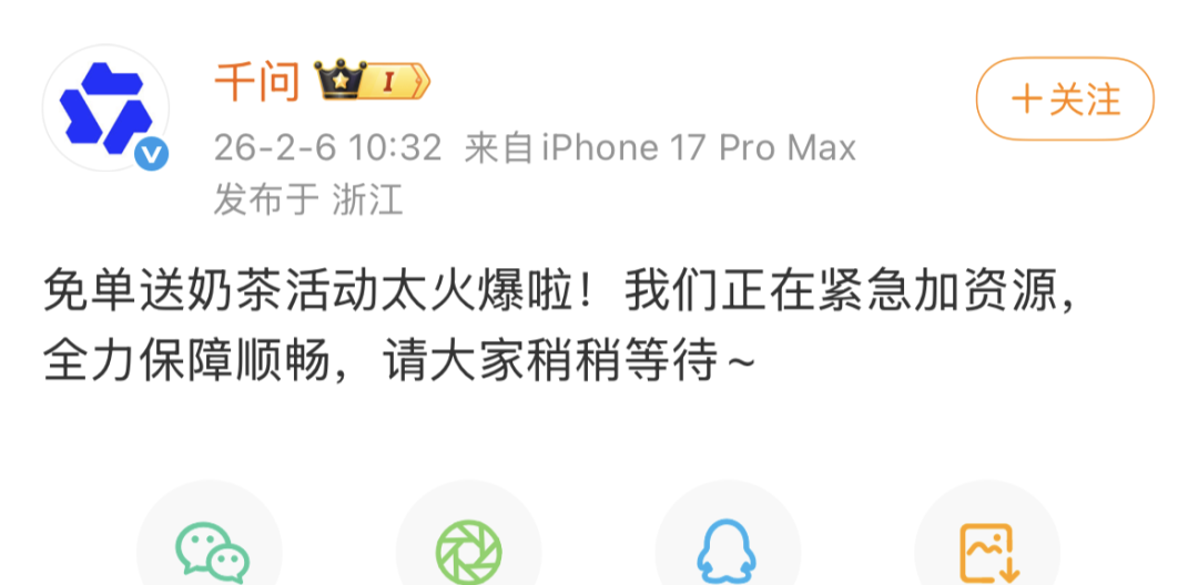 不过,有用户发现,在参与奶茶免单时,页面无法点击,信息显示“系统开小差了,稍后再试吧”,虽然最后成功下单,但过程并不丝滑。对此,千问APP在官方微博账号上表示:“免单送奶茶活动太火爆啦,我们正在紧急加资源,全力保障顺畅,请大家稍稍等待。”