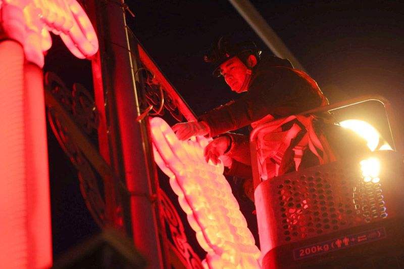 天安门西,国网北京电力城市照明管理中心工作人员维护大红灯笼灯饰。