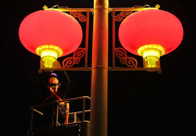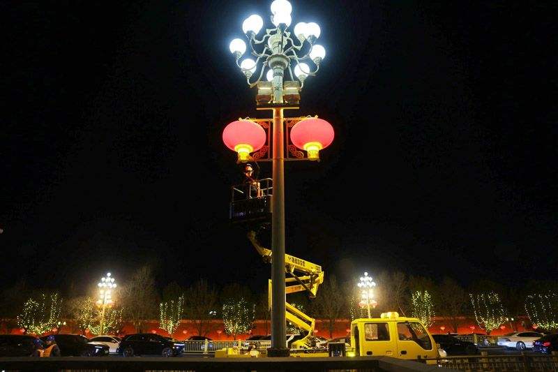 天安门西,国网北京电力城市照明管理中心工作人员维护大红灯笼灯饰。 针对天安门广场地区华灯及周边的照明设施,照明中心加强特检特巡,确保该地区城市照明设备的安全稳定运行。