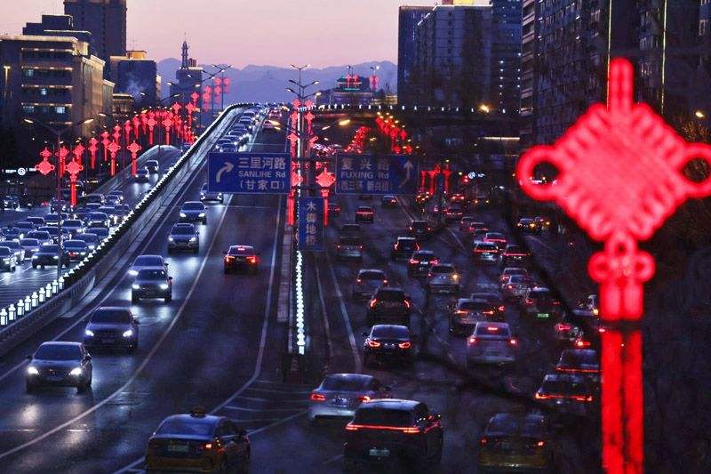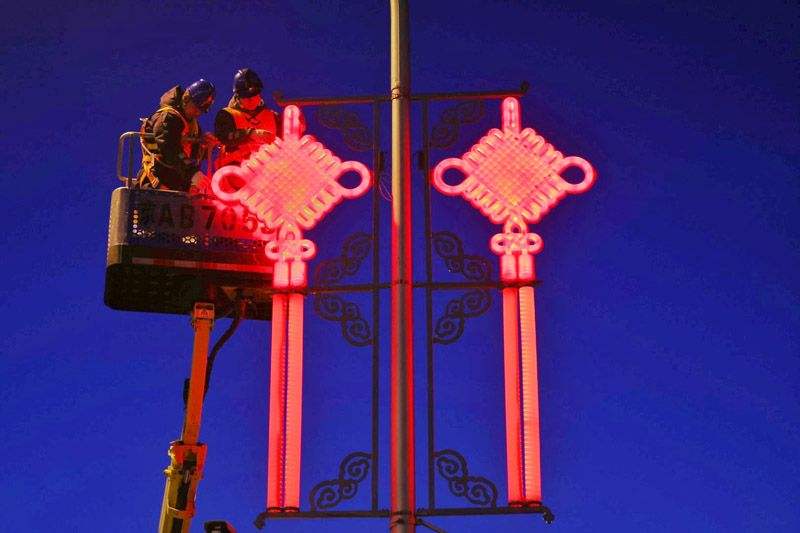 2月6日晚,长安街沿线春节景观灯饰进入“春节模式”,国网北京电力城市照明管理中心工作人员在木樨地桥调试中国结灯饰。当晚,长安街及其沿线的春节景观布置已全部就位。