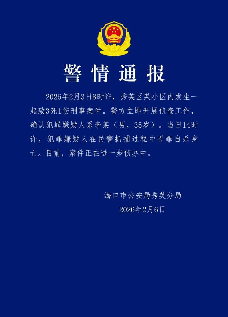 海口一小区发生致3死1伤刑案,嫌疑人在抓捕过程中畏罪自杀身亡