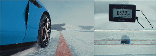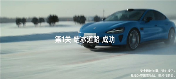 镜头聚焦于车辆在冻结冰雪混合路面上的加速表现。在冻结的冰雪混合路面,新一代SU7从41km/h加速至60km/h,行驶非常稳定。
