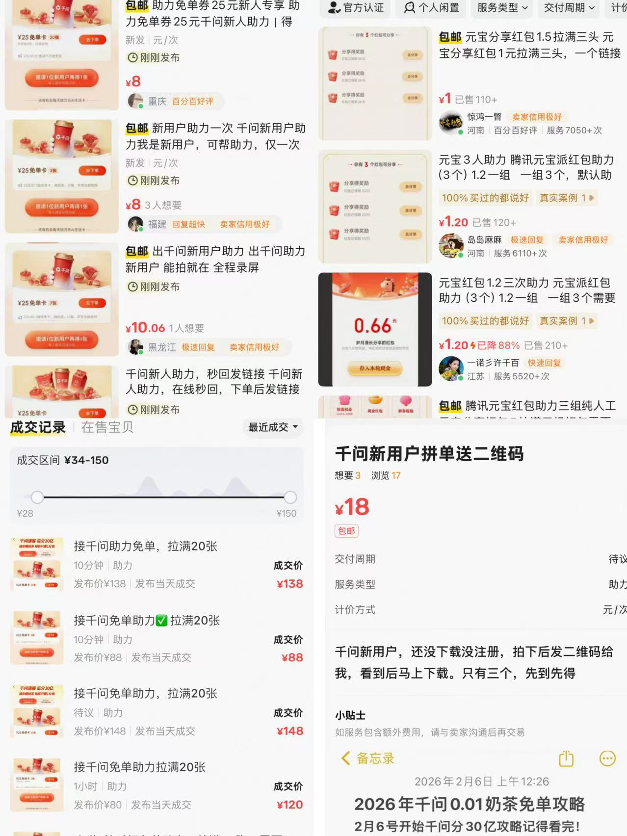 AI应用春节的拉新大战打得火热,2月8日,记者发现,在闲鱼平台,新上架了不少“千问助力”“元宝红包助力”等相关链接,薅AI补贴成了一门新生意,“AI新人”正被批量出售。