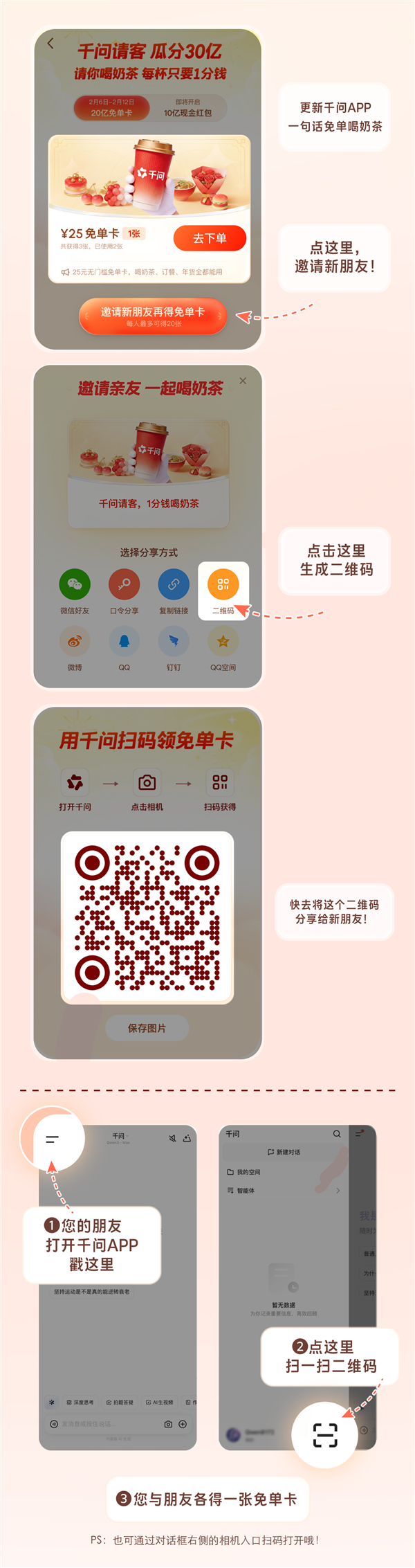 据悉,千问APP于2月6日开启第一波“春节30亿大免单”活动,所有用户只需更新到最新版,就能领取25元无门槛免单卡。