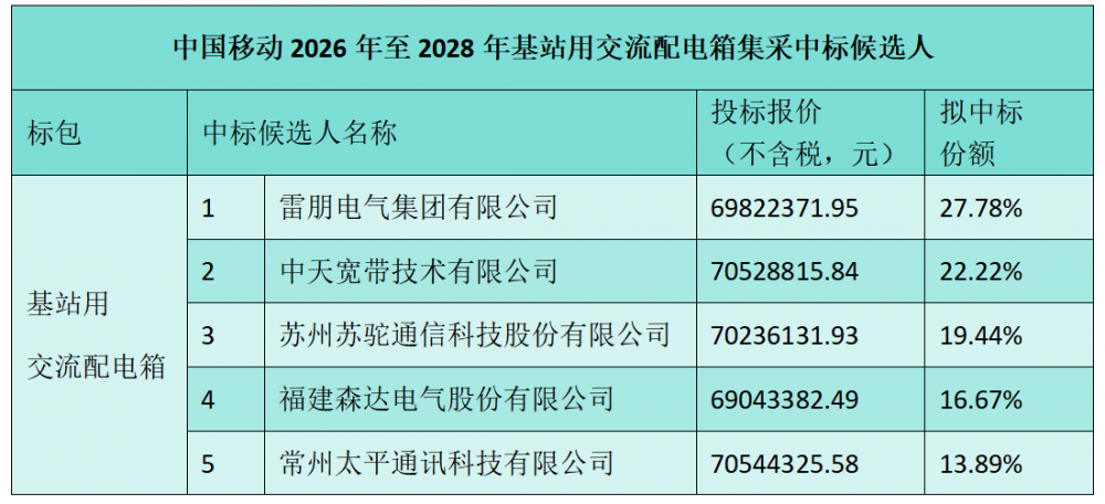 C114讯 2月9日消息(九九)中国移动采购与招标网日前发布2026年至2028年基站用交流配电箱产品集中采购项目中标候选人公示,雷朋电气等五家中标。