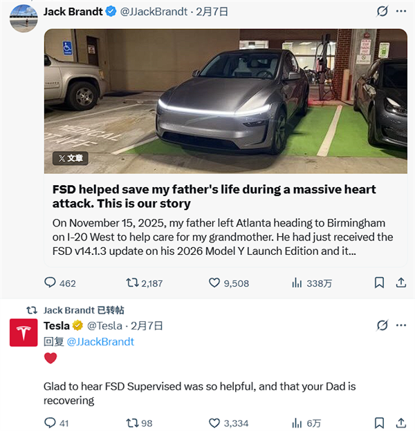 快科技2月9日消息,近日,X平台博主Jack Brandt分享了一则特斯拉FSD(完全自动驾驶)“救命”的故事,吸引了众多关注,甚至特斯拉官方都在评论区留言。