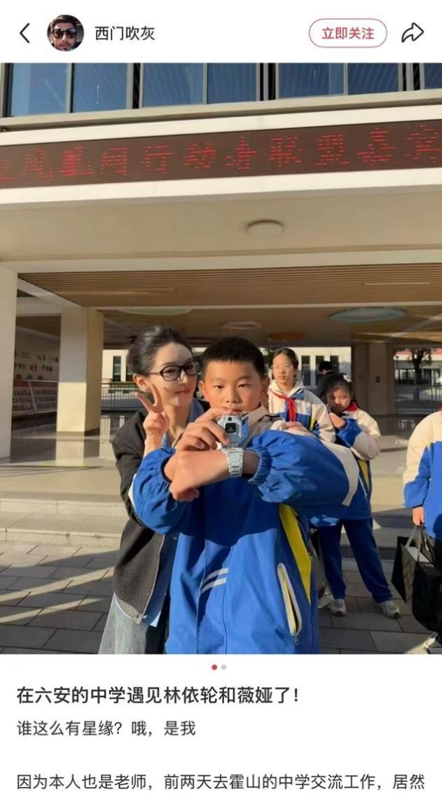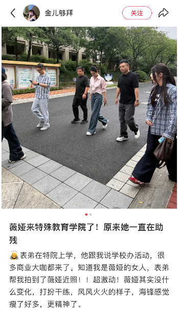 发帖的应该是薇娅的粉丝,照片中的薇娅,穿着牛仔裤和粉色衬衫,正走在某特殊教育学院的校园里。
