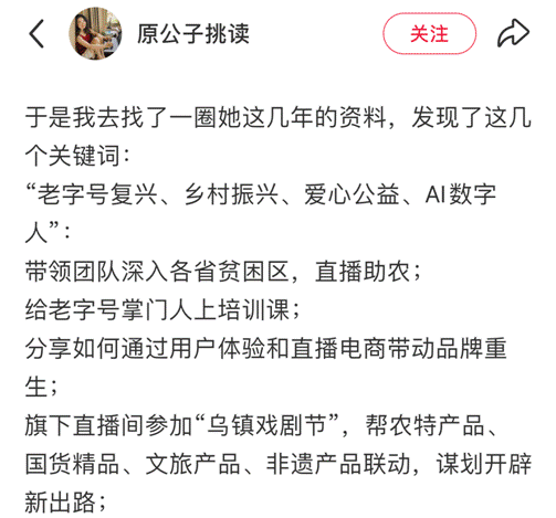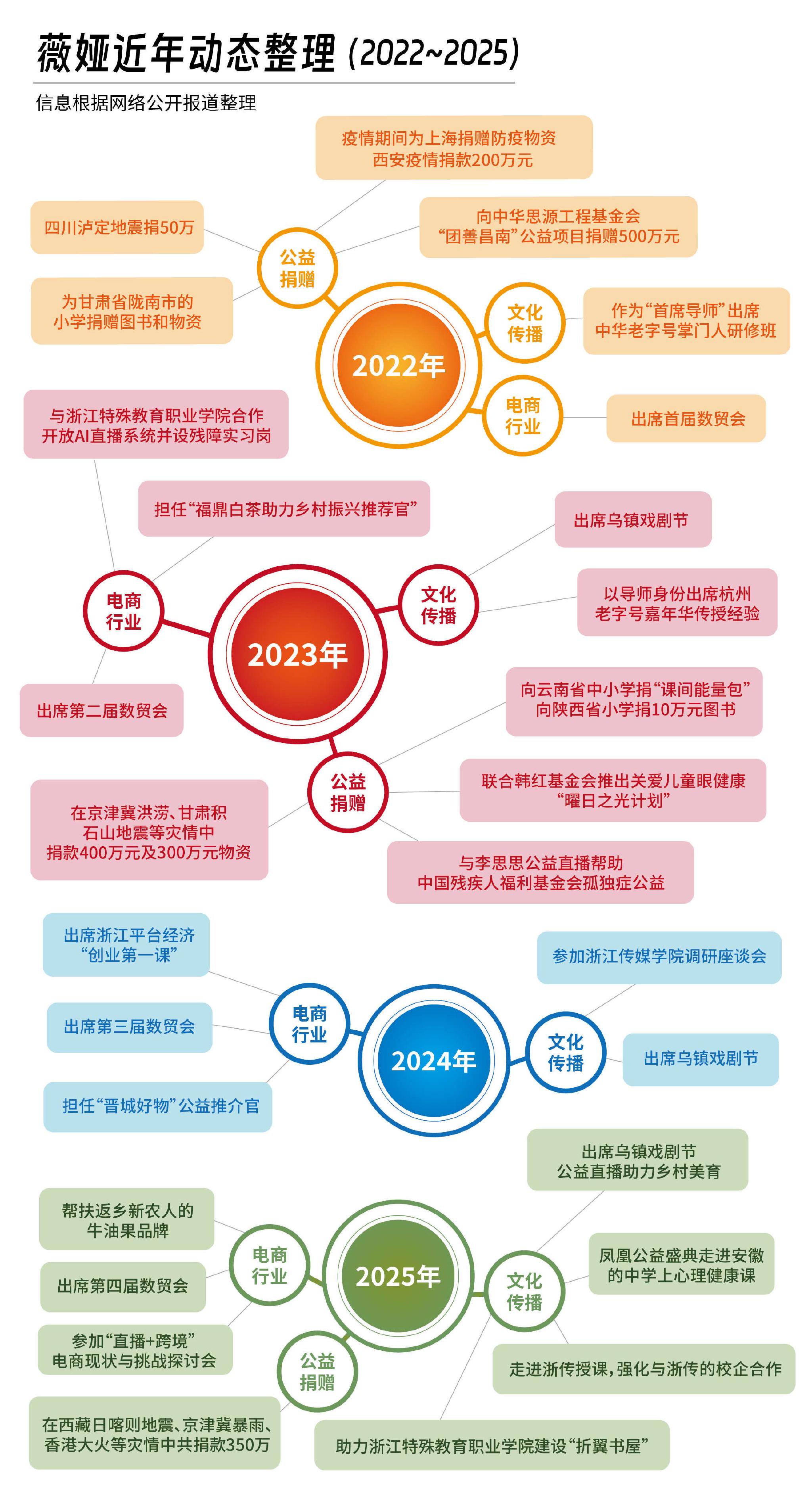 从上图可以看到,跟很多人对薇娅的印象还停留在“直播带货”不同,薇娅这几年从直播间抽身后,生活变得更丰富了——在电商、文化传播、教育以及灾难捐赠几个方面都干了不少事。不过,这些事其实都围绕两个核心,一个是“电商”,一个是“公益”。