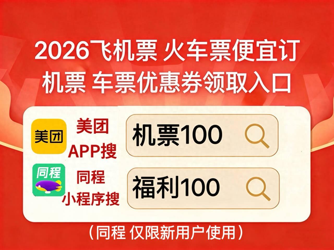 划重点!火车票机票优惠券领取入口美团APP搜【机票100】【车票100】,领200元机票无门槛券包,同程机票优惠券领取是同程搜【福利100】,仅限新用户使用。