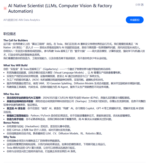 几乎同一时间,有网友发现,特斯拉在上海已开招AI原生科学家,并在岗位中描述称:真正的AI原生者,你不仅是在“使用”AI,更是在“构建”AI。