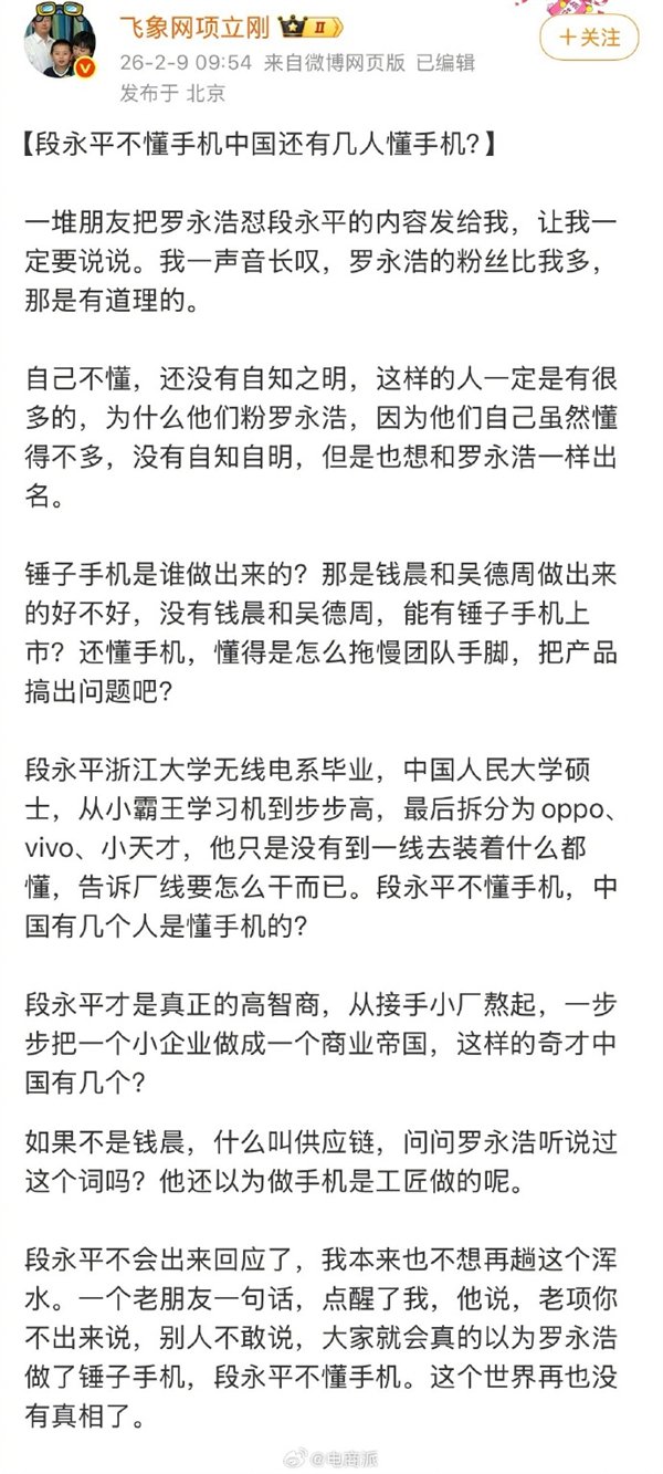 “如果不是钱晨,什么叫供应链,问问罗永浩听说过这个词吗?他还以为做手机是工匠做的呢。段永平不会出来回应了,我本来也不想再趟这个浑水。一个老朋友一句话,点醒了我,他说,老项你不出来说,别人不敢说,大家就会真的以为罗永浩做了锤子手机,段永平不懂手机。这个世界再也没有真相了。”项立刚无奈的说道。