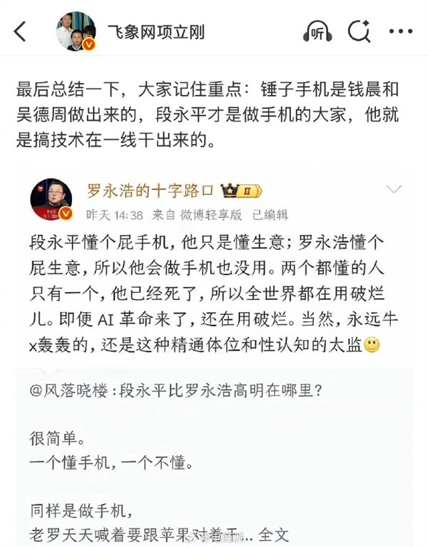 近日,罗永浩发文称,段永平不懂手机,只是懂生意,而他自己不懂生意,所以会做手机也没用。