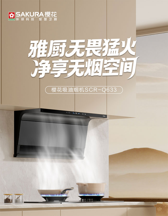 樱花吸油烟机Q633以高效净吸的实力,在不动声色间守护家的宁静,让厨房回归纯粹的自在,重拾优雅与舒心。
