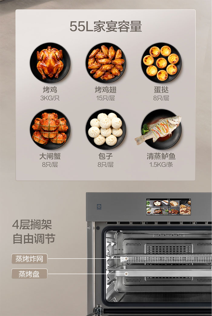 55L的超大容量设计,樱花蒸烤箱C5502A让聚会时刻依旧从容不迫。四层可调节搁架可根据食材大小自由组合,一次出炉多重美味,无论是朋友聚餐,还是节日宴请,都能游刃有余地呈现一桌丰盛佳肴。