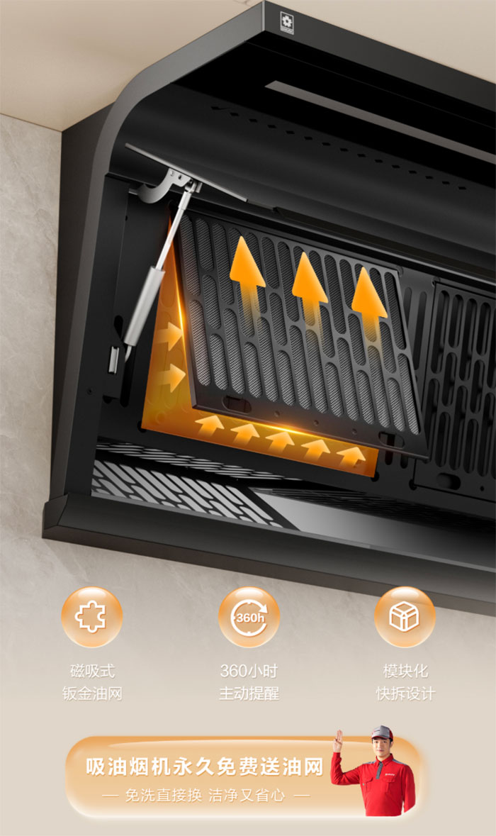 化繁为简的滤网智换,让生活加倍省心,樱花吸油烟机Q633采用磁吸式钣金油网,模块化结构,轻轻一拉,即可轻松取下,快拆易洁,不留死角。在累计使用360小时后,会主动提示更换油网,确保油网始终处于最佳的过滤状态。更贴心的是,SAKURA樱花承诺“吸油烟机永久免费送油网”,用户无需费力清洗油污厚重的旧网,直接更换新网即可安心使用,为家务节省了大量的时间和体力消耗。