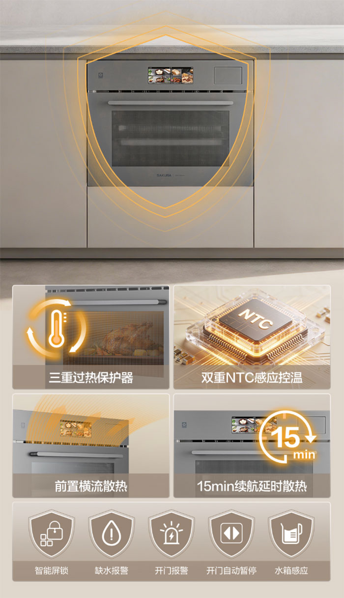 在追求美味的同时,樱花蒸烤箱C5502A集成多项防护措施守护全家烹饪安全,如三重过热保护器、双重NTC感应控温、前置横流散热、15分钟续航延时散热等设计,确保机器持久稳定运行。更有智能屏锁、缺水报警、开门报警、开门自动暂停、水箱感应等功能,细致守护烹饪的每一个瞬间,尽情释放对美食的想象与热爱。