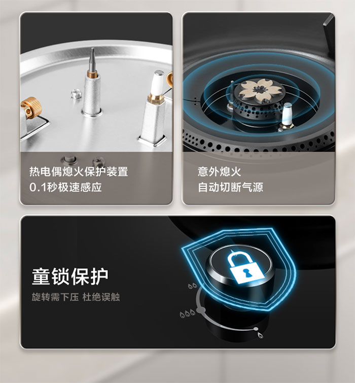 全域守护,为烹饪构筑加倍的安心,樱花燃气灶S839G内置热电偶熄火保护装置反应,能在0.1秒内极速感应到火焰意外熄灭的情况,并立即自动切断燃气阀门,从根本上杜绝燃气泄漏的风险。对于有孩童的家庭,樱花燃气灶S839G贴心配备的童锁保护功能,更尤为重要。旋钮操作需先下压才能旋转点火,有效防止孩童因好奇而误开燃气,排除潜在危险,时刻守护全家安全。