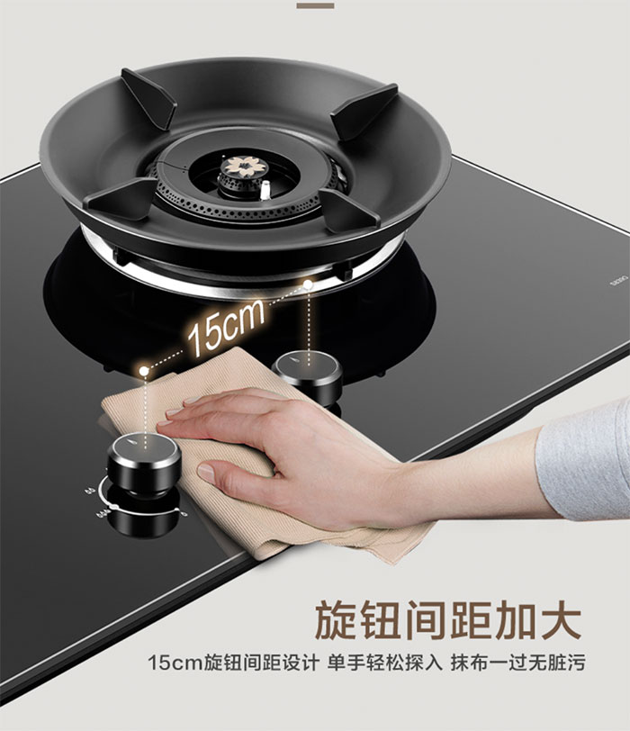 于细节处彰显品质,樱花燃气灶S839G采用8mm防爆钢化玻璃面板,不仅拥有晶莹剔透的美感,更具卓越的坚固性与耐高温能力,使用起来格外安心。旋钮间距加大至15cm,避免操作时手部的局促,更为清洁留下充裕的空间,单手亦可轻松探入旋钮之间,真正做到“一抹即净”,日常打理变得毫不费力。