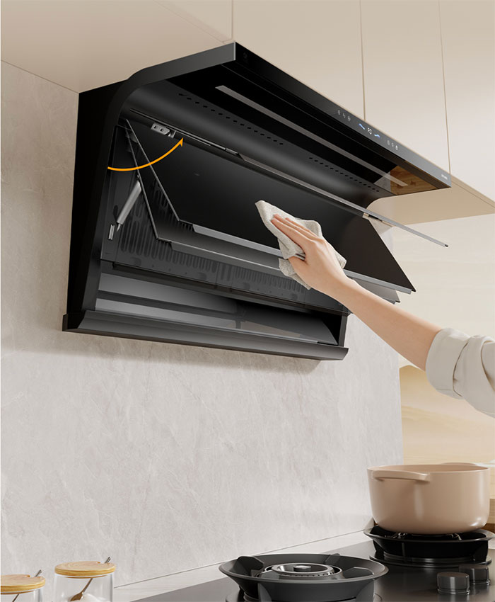 线条简洁的纤薄机身,让视觉上更显开阔明亮。一体式AG易洁玻璃面板,油污一抹即净,让洁净始终如一。更有智能体感智控系统,隔空挥手操作,让下厨时刻流畅便利,更不易沾染油污。明亮柔和的天幕大灯设计,则在细节处尽显人性关怀,让食材色泽真实呈现,每一次下厨都充满仪式感。