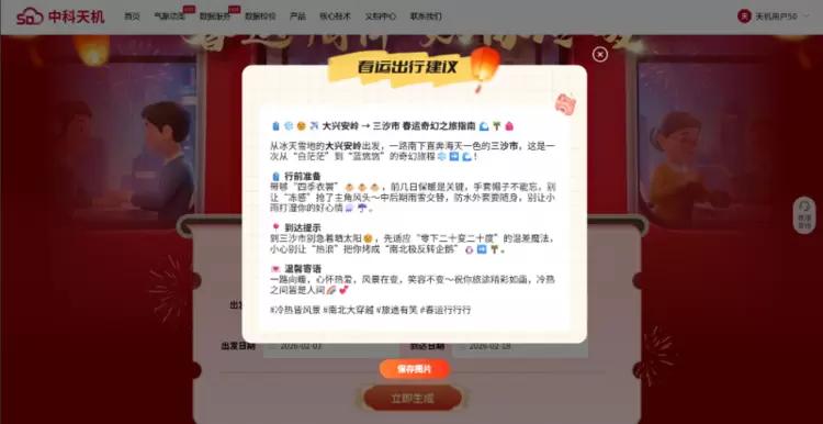 在中科天机官网(www.tjweather.com)进入活动页面,您无需注册就可选择涵盖全国各省的往返城市与时间,以生成专属春节出行气象建议。建议不仅清晰告知出发地与到达地衣物穿搭、防护提示,更用“千人千面”卡片形式让严肃气象服务变得兼具趣味性与实用性,而在贴心服务能力背后则是中科曙光超强算力,以及天机“超级动力SD3”引擎。