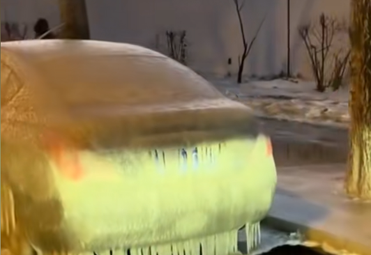 一辆轿车全车被厚厚的冰层包上,车尾还滴挂有冰凌,车门完全被冻上。有车主带着菜刀和锤子,对着车门凿冰。