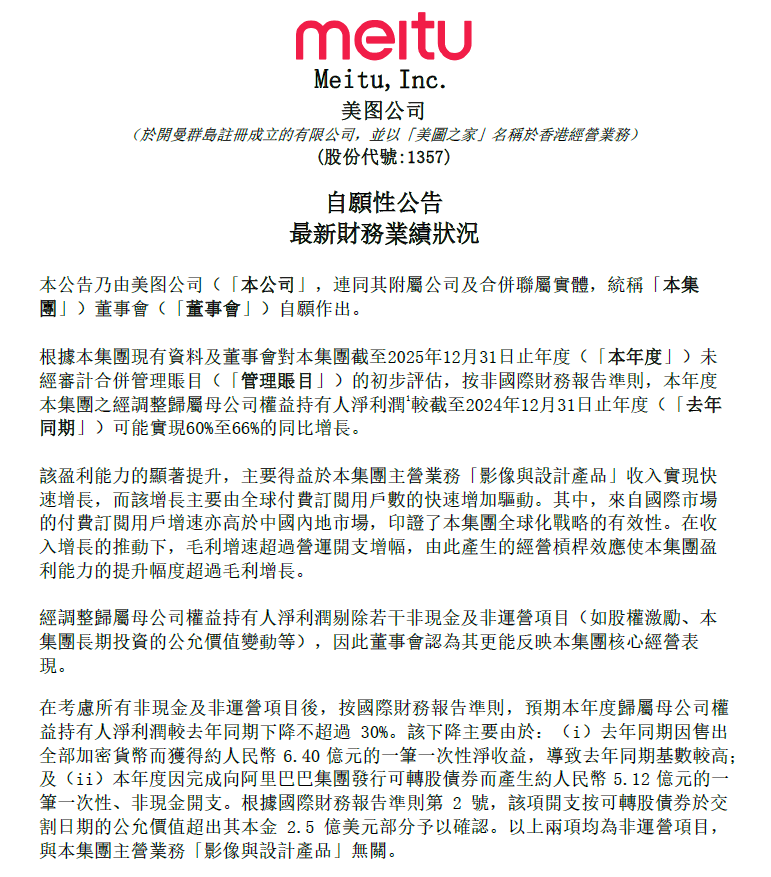 公告显示,按非国际财务报告准则,美图2025年度经调整归属母公司权益持有人净利润较2024年同期可能实现 60%至66% 的同比增长。