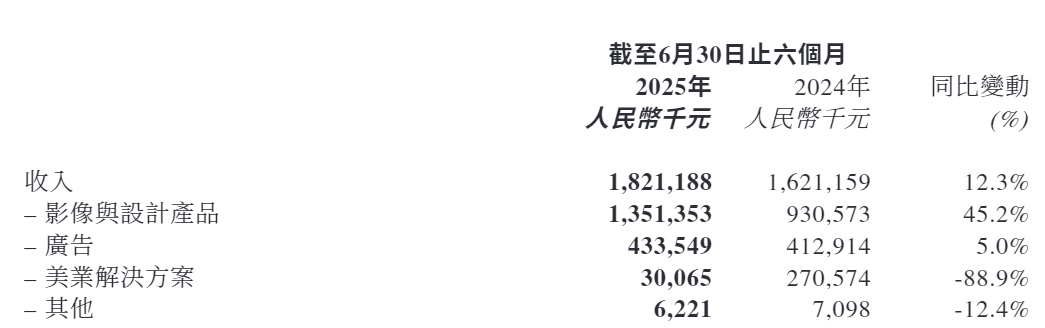 根据2025年中报,美图收入来自于影像与设计产品、广告、美业解决方案及其他。其中,影像与设计产品收入占比最大,增速也最快。