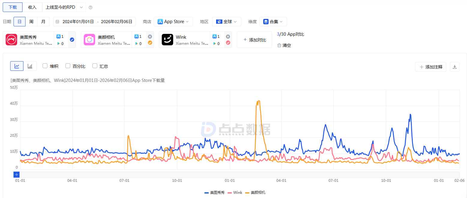根据全球移动应用、游戏数据监测服务商点点数据的监测,美图秀秀、美颜相机和Wink这3款产品过去1年来自全球iOS端的下载保持平稳,其中美图秀秀表现较为突出。