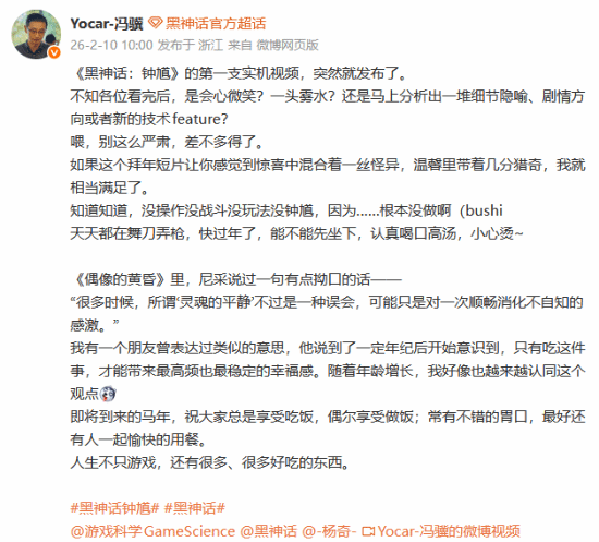 视频发布的同时,游戏科学创始人兼游戏制作人冯骥也发微博谈到了这支实机视频。