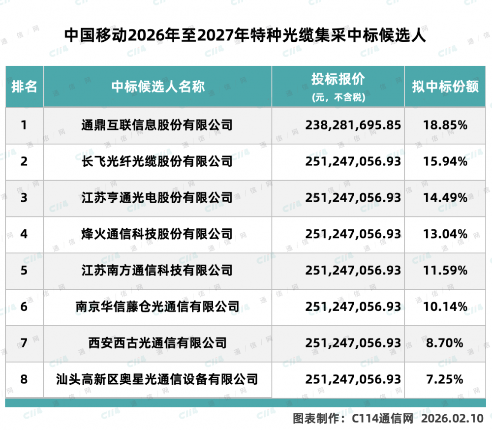 C114讯 2月10日消息(水易)来自中国移动采购与招标网消息,中国移动2026年至2027年特种光缆产品集中采购项目已完成评标工作。结果显示,通鼎互联、长飞、亨通光电、烽火通信等8家厂商入围。