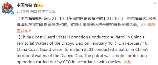 新京报讯 据中国海警官博消息,2月10日,中国海警2503舰艇编队在我钓鱼岛领海内巡航。这是中国海警依法开展的维权巡航活动。