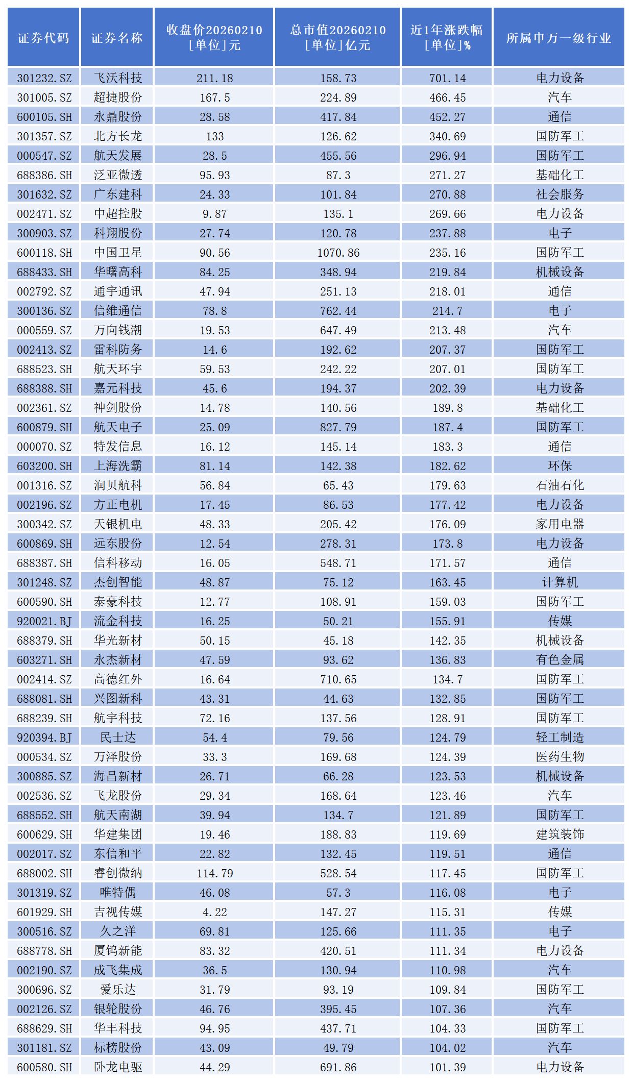 从二级市场表现看,近一年来,475家上市公司中,股价实现上涨的有389家。其中,52家涨幅超过100%。飞沃科技(301232.SZ)、超捷股份(301005.SZ)、永鼎股份(600105.SH)、北方长龙(301357.SZ)、航天发展(000547.SZ)、泛亚微透(688386.SH)、广东建科(301632.SZ)、中超控股(002471.SZ)、科翔股份(300903.SZ)、中国卫星(600118.SH)、华曙高科(688433.SH)、通宇通讯(002792.SZ)、信维通信(300136.SZ)、万向钱潮(000559.SZ)、雷科防务(002413.SZ)、航天环宇(688523.SH)、嘉元科技(688388.SH)等17家公司近一年股价涨幅超过200。