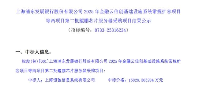 近日,上海浦东发展银行正式公布《2025 年金融云信创基础设施系统常规扩容项目等两项目第二批鲲鹏芯片服务器采购项目》中标结果,项目中标金额达 1.58 亿元,由神州鲲泰金牌代理商上海恒驰信息系统有限公司中标。本项目中标的核心产品为神州数码旗下AI基础设施品牌神州鲲泰的系列服务器,作为项目核心供应方,神州鲲泰将全程提供高性能鲲鹏芯片服务器设备,为浦发银行金融云信创基础设施扩容筑牢核心算力底座,全力助力其数字化转型与信创战略深度落地。