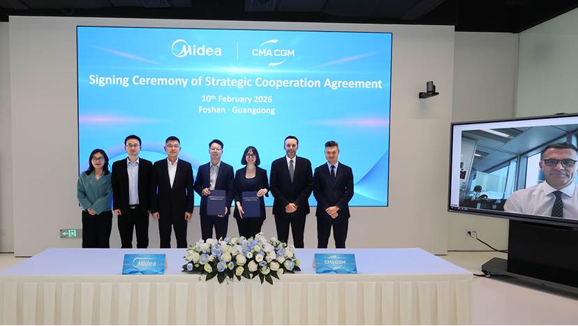 2026年2月10日,美的集团与全球海陆空运输与物流解决方案领军者达飞集团(CMA CGM)正式签署战略合作备忘录(MOU),旨在深化双方全球范围内的战略协作,共同探索物流与技术创新,打造更智能、高效、可持续的端到端供应链解决方案。