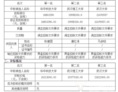 依据评标结果公示,本项目三家中标候选人分别是华中科技大学、武汉理工大学和武汉大学。其中,华中科技大学和武汉大学都是国内985高校,武汉理工大学虽然不是985高校,不过也是国内知名211名校。