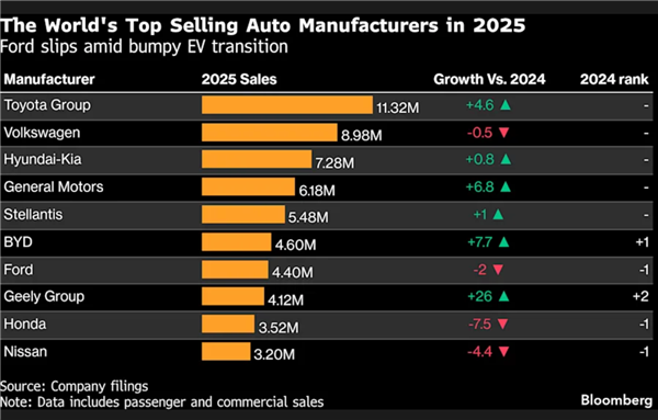 全球销量冠军依旧由丰田集团蝉联,其2025年全球销量同比增长4.6%,连续第六年位居全球汽车销量榜首。