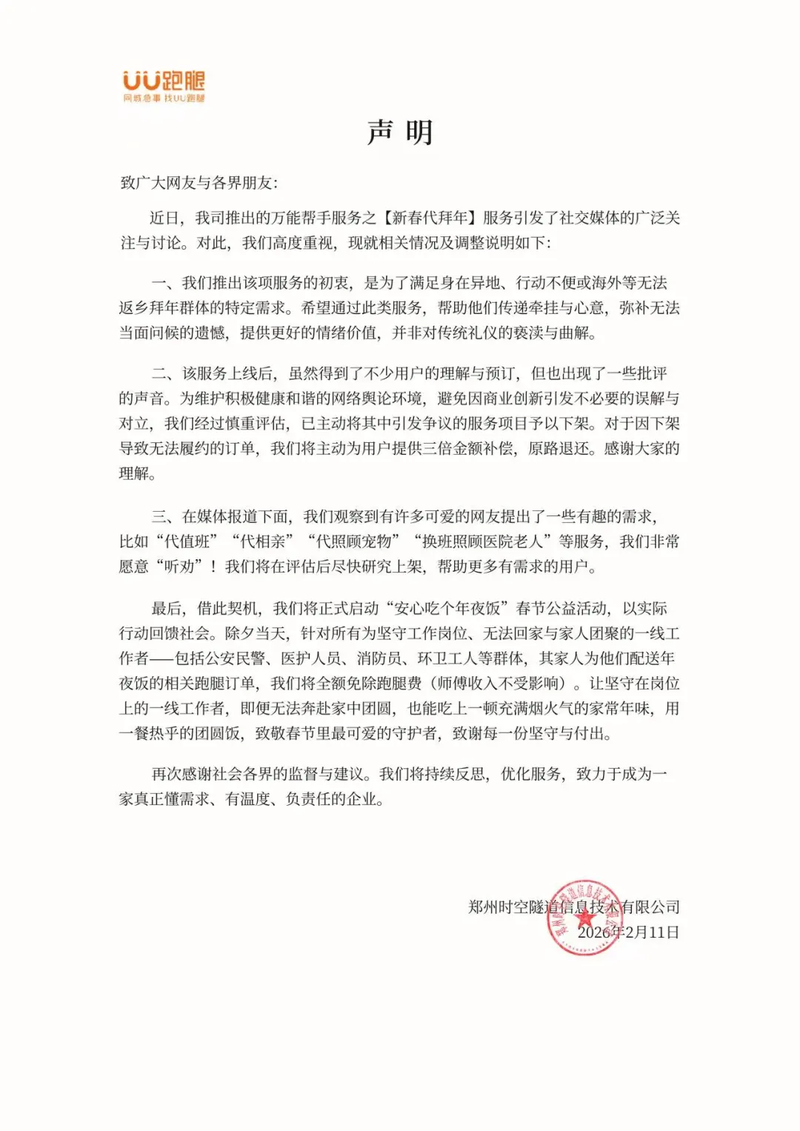据媒体报道,近日,UU跑腿推出春节代拜年套餐,其中“代拜长辈套餐”除了代买代送年货礼品外,还提供1分钟吉祥话祝福、代行磕头礼、实时视频直播等服务,2小时收费999元。对此,2月10日,UU跑腿有关负责人回应记者表示,“推出相关服务的核心初衷是回应具体的社会现实,即确实存在一部分人因客观原因无法在春节返乡与亲人团聚。目前代拜长辈套餐已取消,产品也还在调整中。”