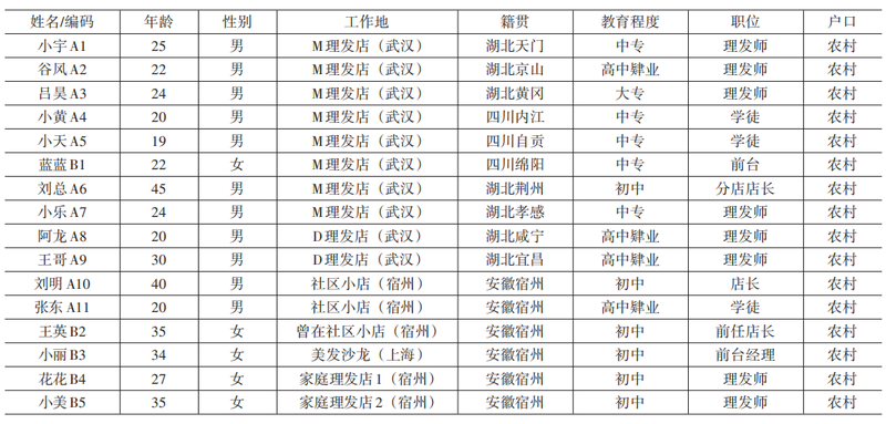 作为一项质性研究,本文采取的主要研究方法是访谈法和参与式观察。我们首先是作为理发店的顾客,在消费过程中通过攀谈(包括诉诸“老乡”关系)的方式与理发师和其他工作人员建立关系。同时,我们通过寻找中间人来详细了解理发店的内部运作。访谈对象主要包括理发师、学徒、前台小妹、店长、顾客(未放入信息表)。资料主要通过多次无结构式访谈、半结构式访谈以及日常对话收集得来,访谈时间基本为2至3小时。虽然大型理发店中的女理发师寥寥无几,我们仍利用“滚雪球”的方式采访了几位女性。我们有意识地选择差异化的访谈对象,以增强研究结论的代表性。从2021年10月至2023年4月,我们在武汉与宿州两地进行了为期一年多的田野研究。在访谈的同时,我们还在理发店进行了持续的参与式观察,尤其是近距离观察理发师刘明和阿龙的工作,每次时间长达一天。除此之外,我们还对上海的一家理发店进行了简短的调研。