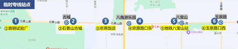 公交临时专线覆盖首钢园、地铁古城站、石景山游乐园、地铁八角游乐园站、地铁八宝山站及地铁玉泉路站等重点区域和轨道站点,在临时封站停运期间,全力保障沿线市民快速接驳地铁1号线玉泉路站。
